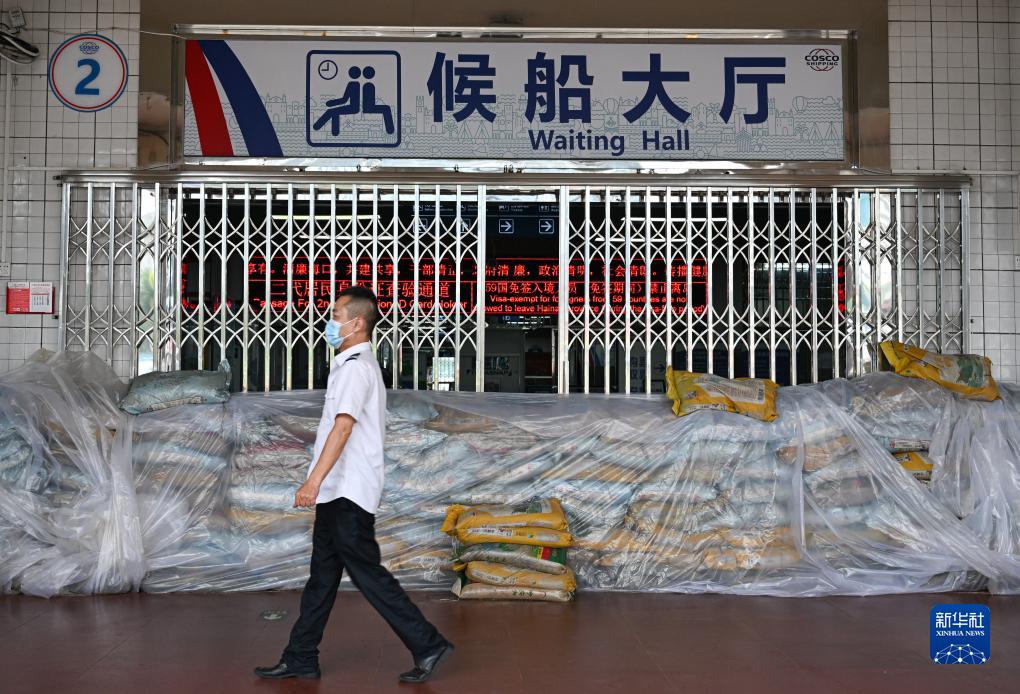 9月2日下午,海南省??谑行阌⒏酆虼髲d關閉,大廳門外已布設了防汛沙袋。