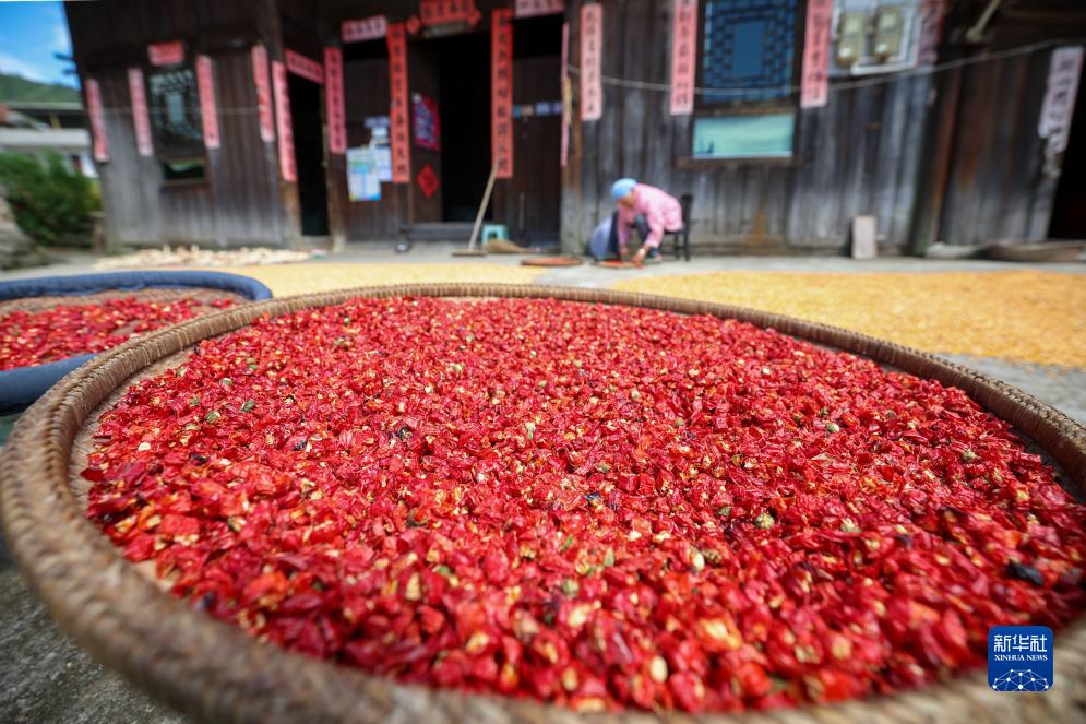 9月2日,村民在貴州省黔東南苗族侗族自治州丹寨縣龍泉鎮得祿村晾曬農作物。