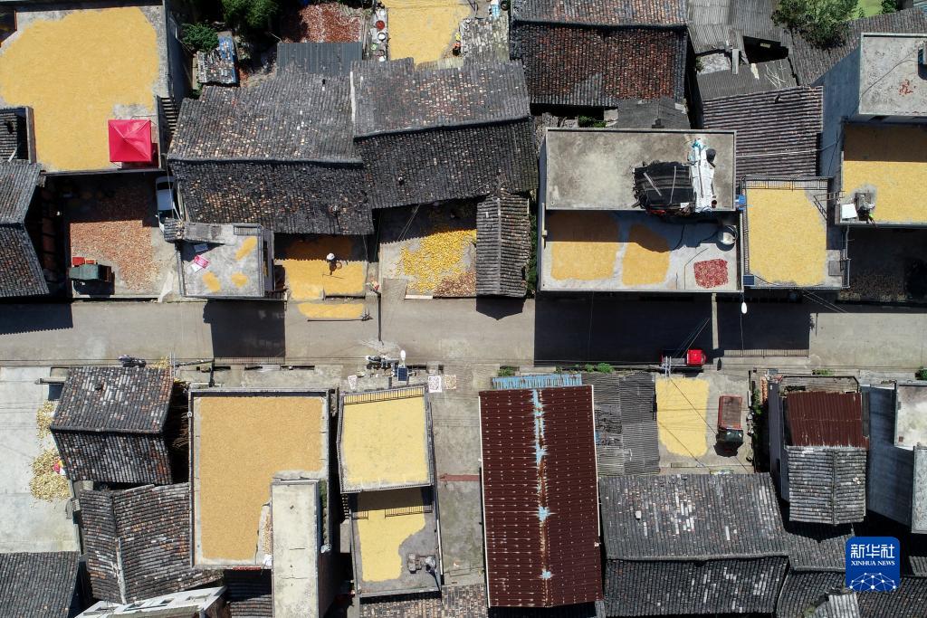 9月2日,村民在貴州省黔東南苗族侗族自治州丹寨縣龍泉鎮得祿村晾曬農作物(無人機照片)。