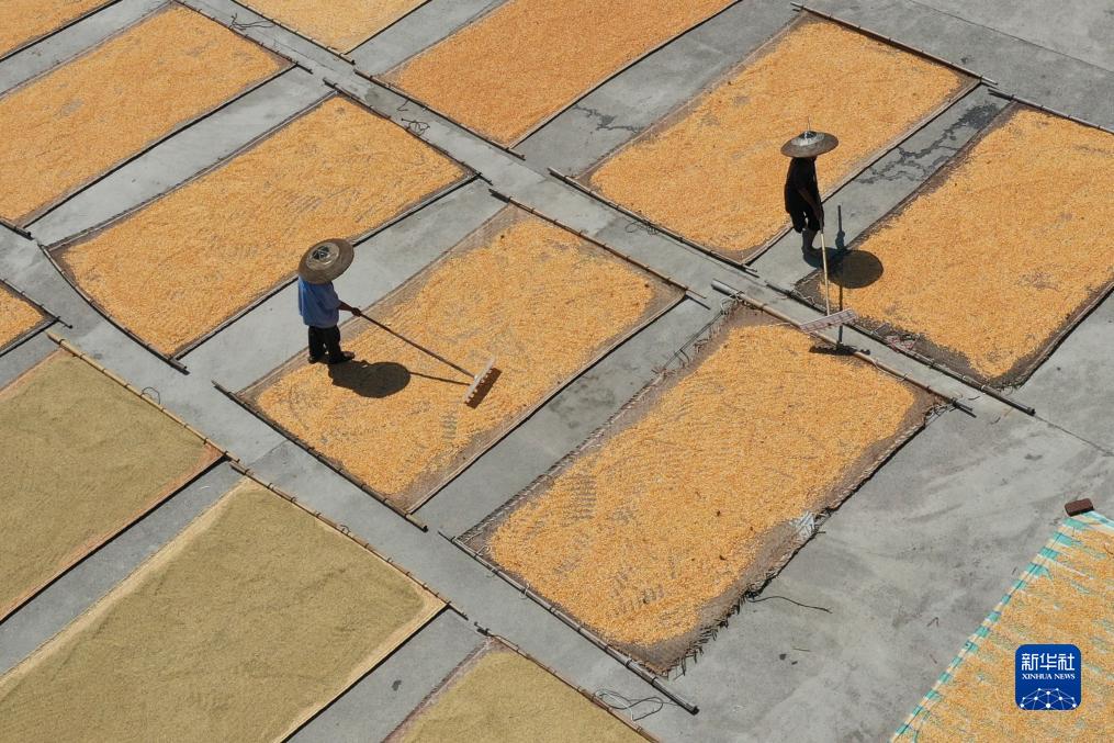 9月2日,貴州省黔東南苗族侗族自治州岑鞏縣注溪鎮衙院村村民在晾曬農作物(無人機照片)。