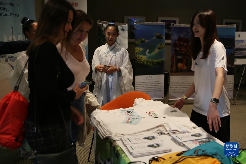 9月1日,在美國紐約花旗球場,一名工作人員在“中華之夜”暨“你好!中國”旅游推廣品牌發布活動上為觀眾介紹情況。