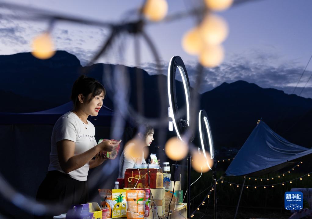 9月2日,在鹽邊縣惠民鎮興隆村的豐收后的稻田里,兩位主播在直播推介當地農特產品。