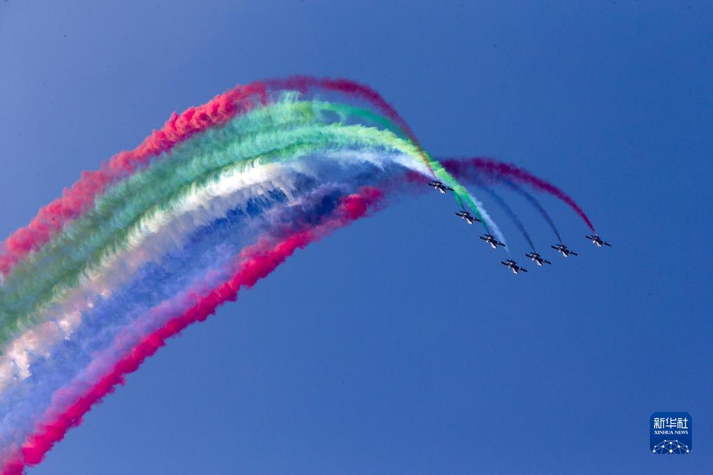 9月2日,在希臘塔納格拉空軍基地的雅典飛行周上,來自阿聯酋的飛行表演隊進行表演。