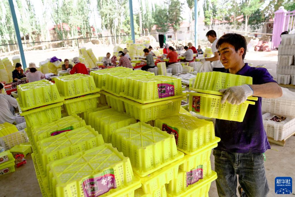 在新疆伽師縣英買里鎮拉依力克村的一家新梅合作社,果農將采摘分揀好的新梅搬運至冷庫(9月2日攝)。