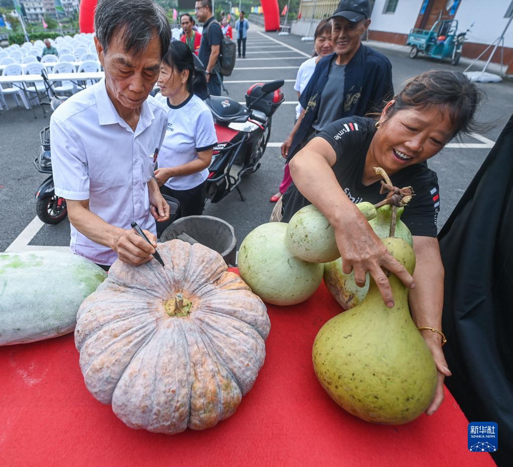 9月3日,王阜村的村民將自家最大的瓜果拿到“報熟節”現場參加果蔬比賽。