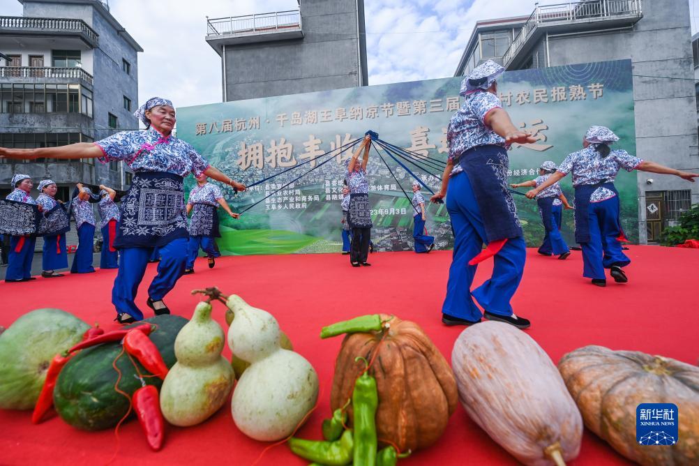 當日,一場別開生面的“擁抱豐收·喜迎亞運·千島湖王阜農民報熟節”在浙江省淳安縣王阜鄉王阜村舉行。當地百姓參加了傳統巡游、村歌演唱、麻繡表演、果蔬競賽、美食及農特產品展銷會等活動?!皥笫旃潯笔峭醺粪l每年金秋時節傳統的民俗節慶活動,慶祝一年勞作后喜獲豐收的幸福,這一習俗也被列入淳安縣非物質文化遺產名錄。