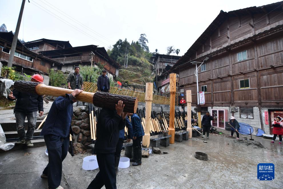烏英苗寨村民在為亮布文化小廣場安裝大型亮布槌(2022年11月19日攝)。新華社記者 黃孝邦 攝