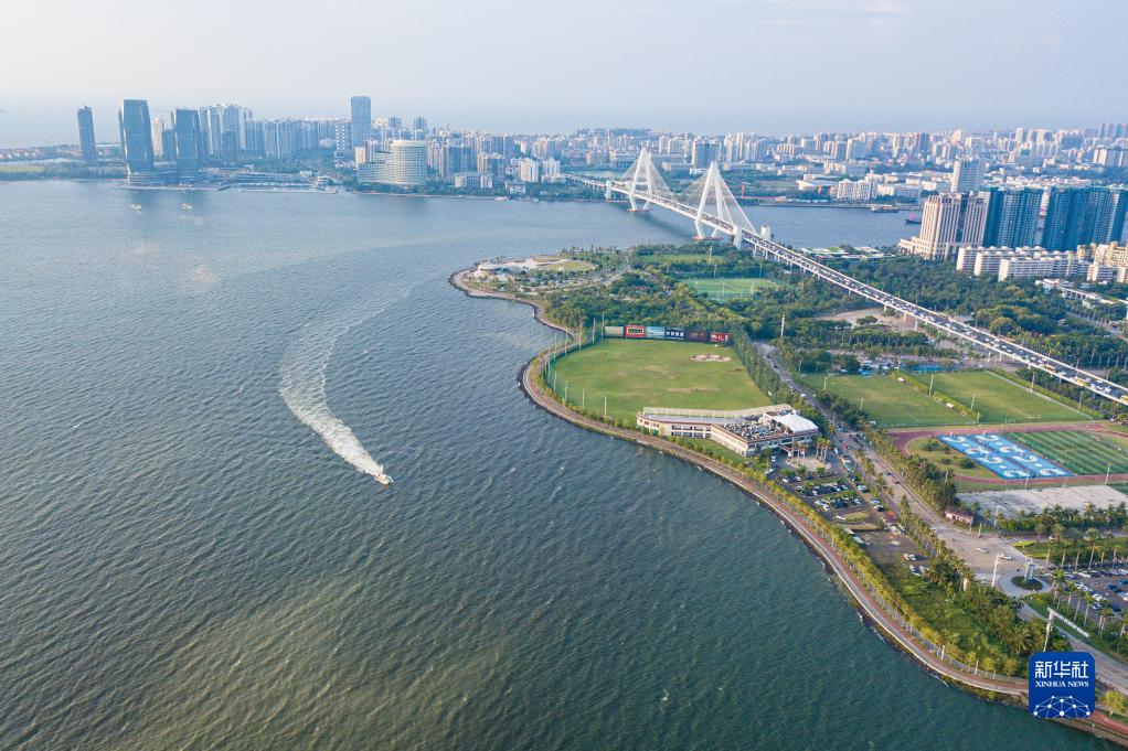 9月1日在海南省??谑信臄z的??跒尘吧o人機照片)。??跒澄挥诤D鲜『?谑兄行膮^,海灣面積268.2平方千米,打造了“椰風海韻、灣城融通”的海灣景觀,是??谑邪l展的重要依托和生態名片。