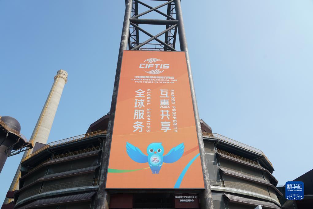 9月3日在首鋼園區拍攝的首鋼一高爐上懸掛著2023服貿會宣傳畫。