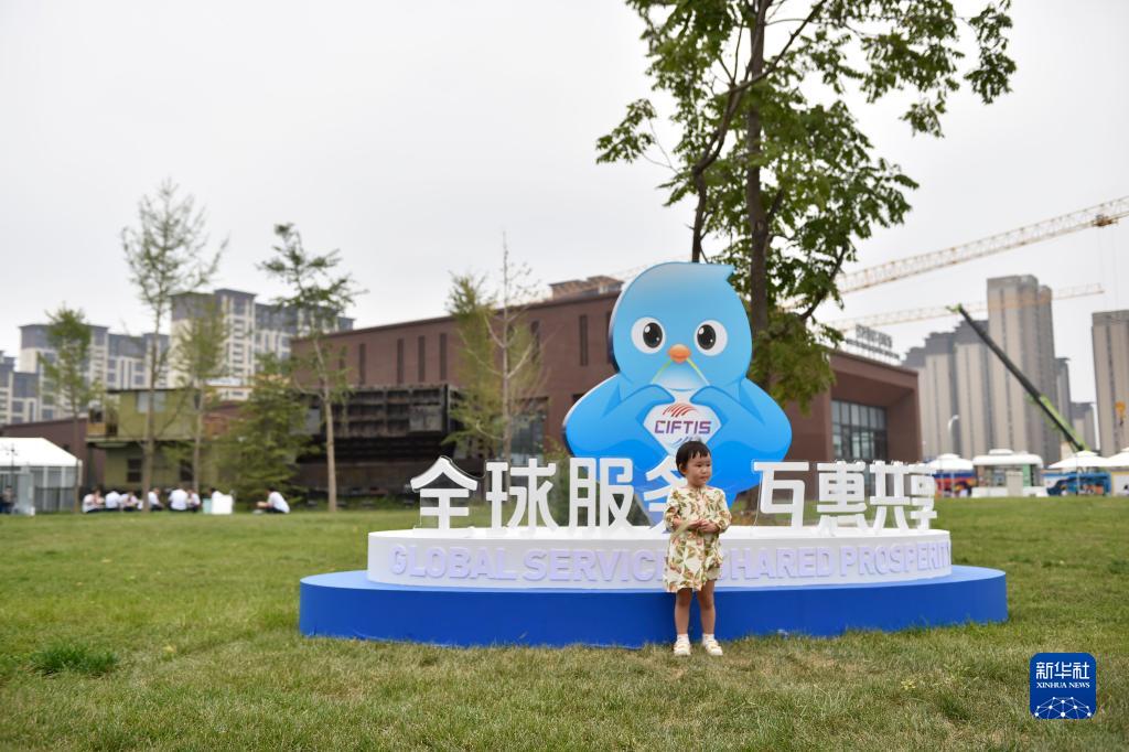 9月2日,在服貿會首鋼園區,小觀眾與“福燕”雕塑合影留念。