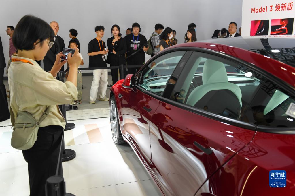9月3日,在國家會議中心的特斯拉公司展臺,參觀者在了解特斯拉展出的新款電動車。