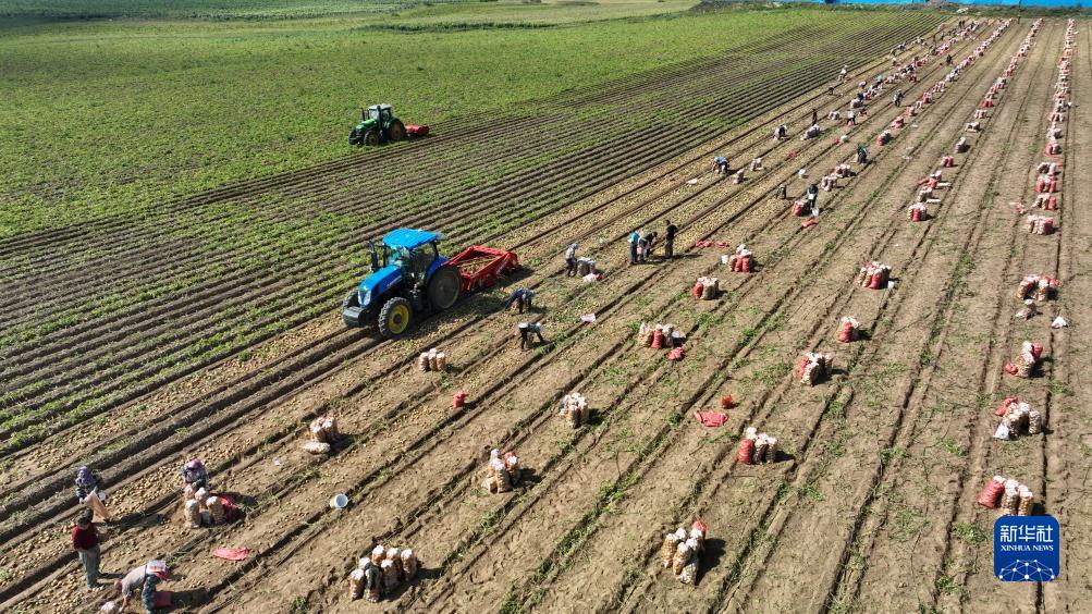 9月3日,河北省圍場滿族蒙古族自治縣御道口鎮御道口村一家馬鈴薯種植合作社社員在收獲馬鈴薯(無人機照片)。