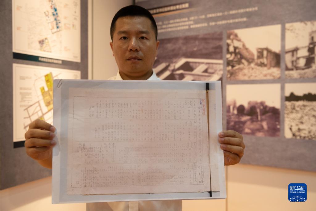 9月2日,在侵華日軍第七三一部隊罪證陳列館,哈爾濱市侵華日軍細菌與毒氣戰史研究會副秘書長金士成展示新一批731部隊軍醫協同犯罪檔案資料。