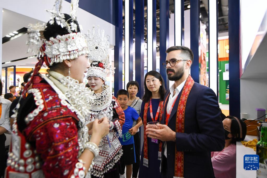 9月3日,在國家會議中心綜合展區的英國展館,來自貴州省黔東南州的演員與英國展館工作人員(前右一)交流。