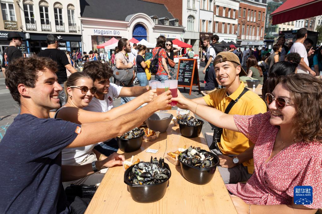 9月3日,在法國里爾舊貨市場上,人們享用貽貝、薯條和啤酒。