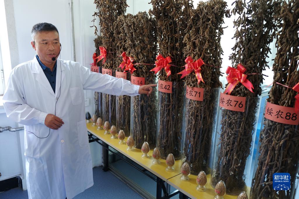 9月3日,黑龍江省農科院綏化分院水稻品種育種所所長聶守軍在標本室介紹種植品種情況。