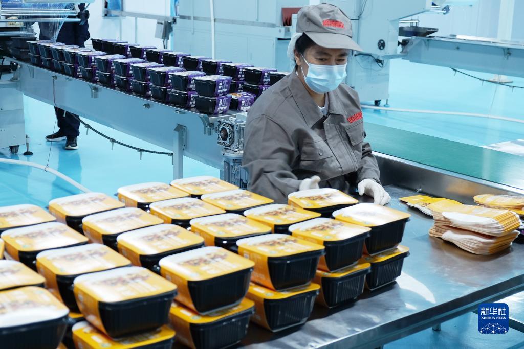 9月4日,在位于綏化市慶安縣的黑龍江倍特食品有限公司生產車間,工作人員在加工制作自熱米飯。