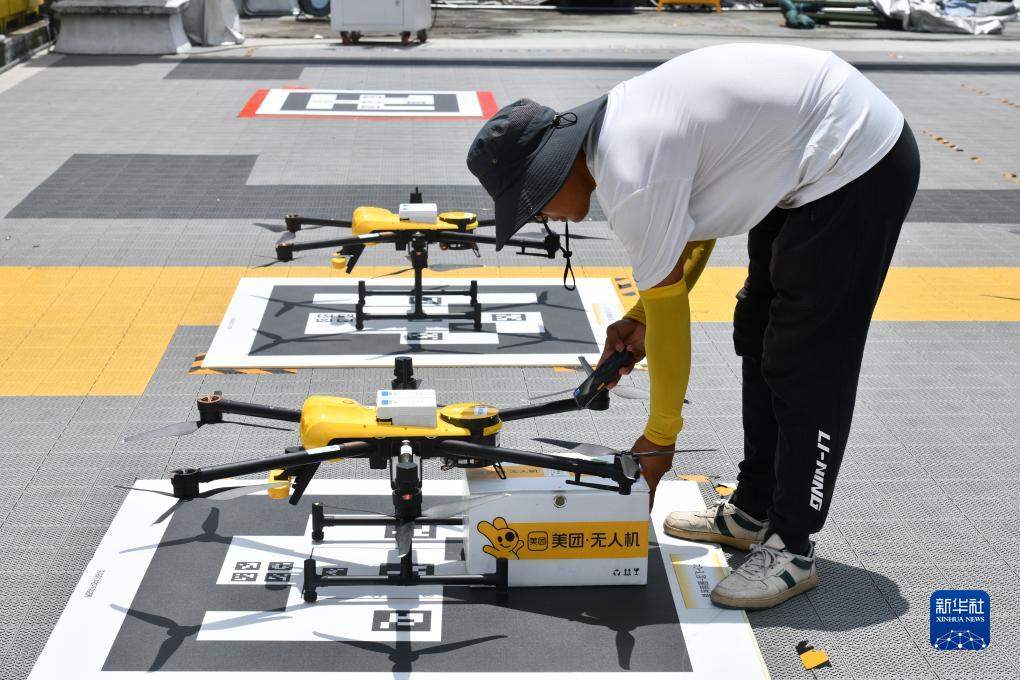 在深圳市龍崗區一處無人機起飛場,工作人員準備掛載餐箱(8月15日攝)。
