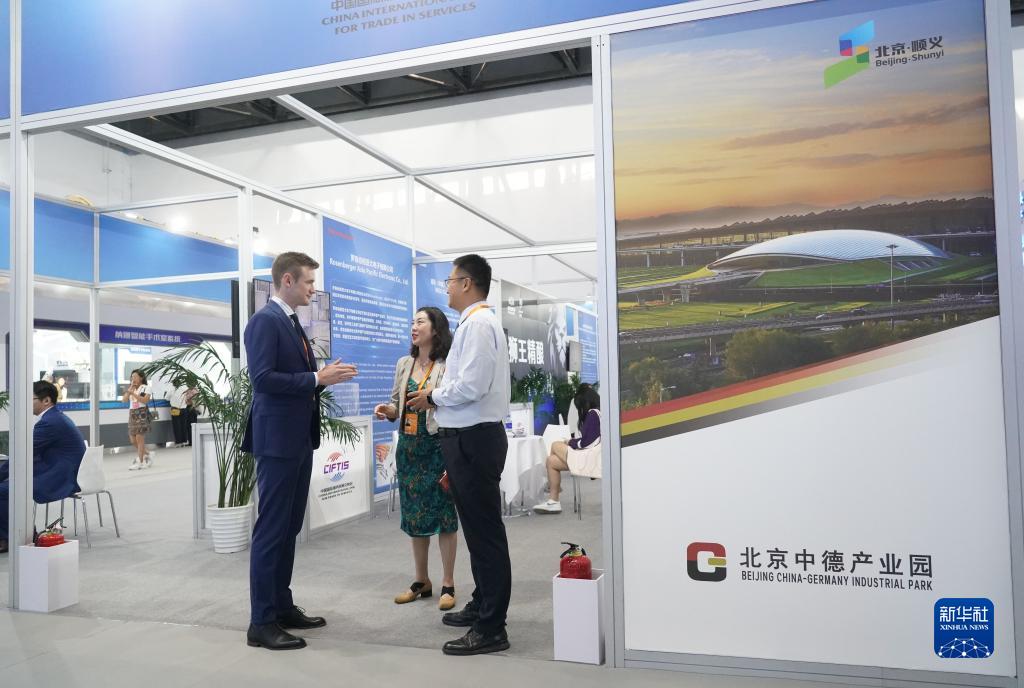 9月4日,與會者在服貿會國家會議中心的北京中德產業園展臺洽談交流。