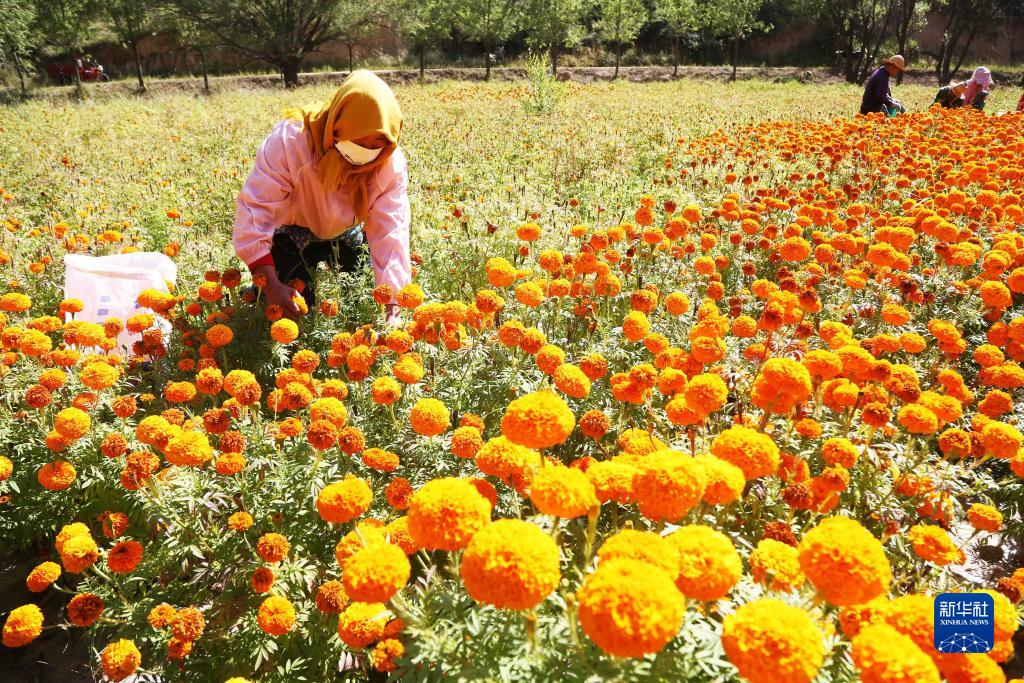 9月4日,農民在甘肅省定西市隴西縣馬河鎮賀家川村采摘萬壽菊。