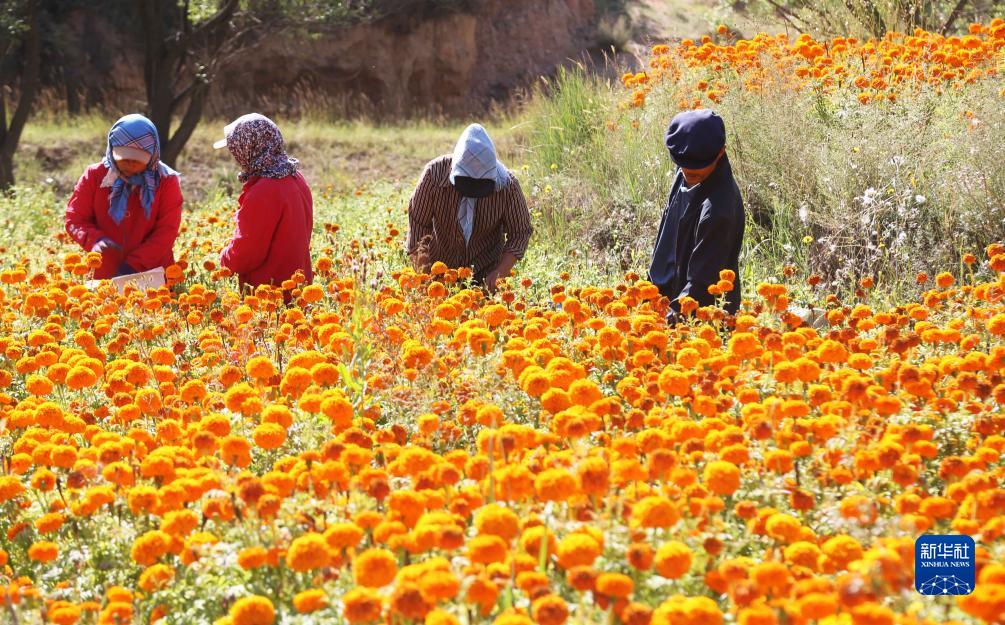 9月4日,農民在甘肅省定西市隴西縣馬河鎮賀家川村采摘萬壽菊。