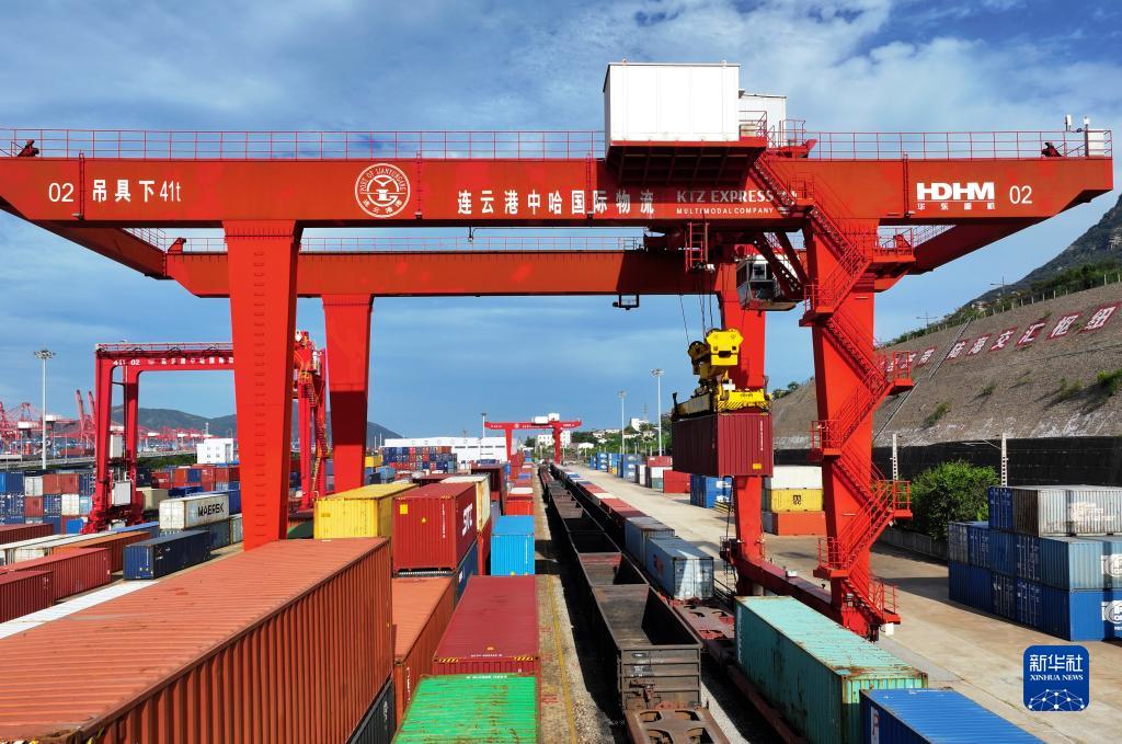 9月4日,在江蘇省連云港市中哈連云港物流合作基地,大型機械在吊裝集裝箱(無人機照片)。