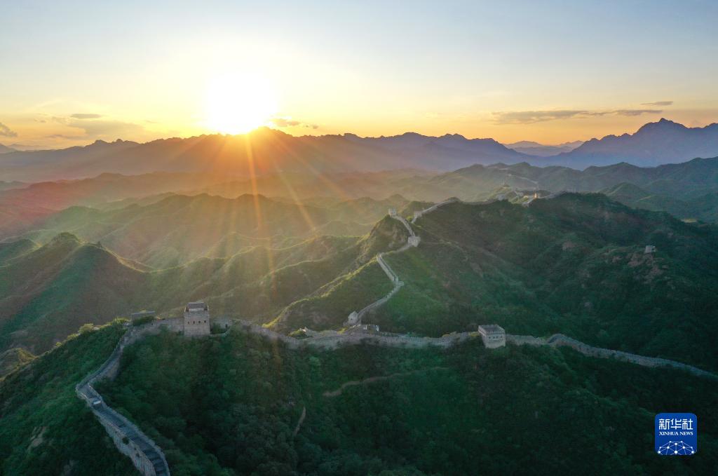黃昏中的金山嶺長城(8月31日攝,無人機照片)。