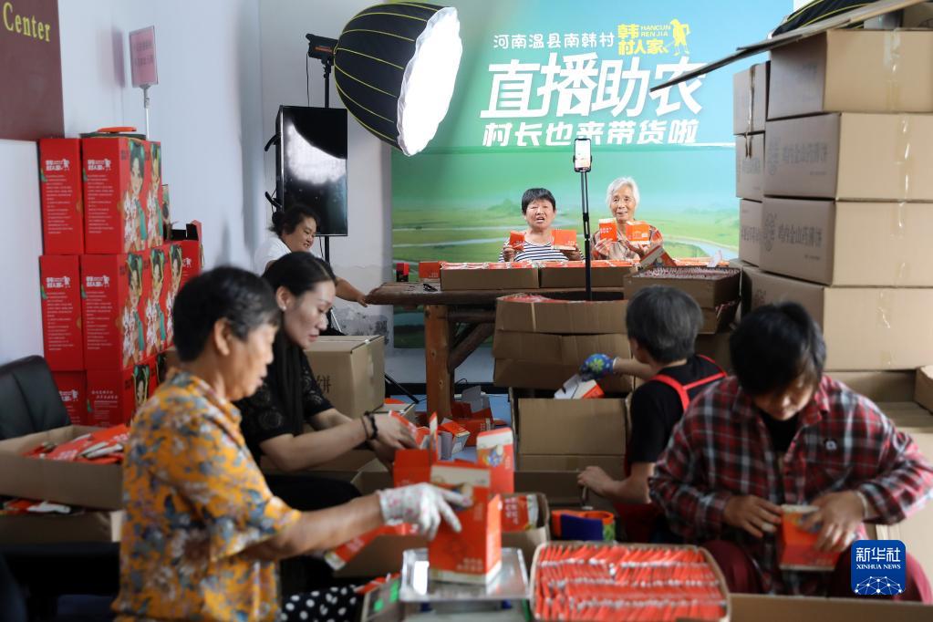 9月4日,在焦作市溫縣黃莊鎮南韓村,村民在直播間包裝當地特產。