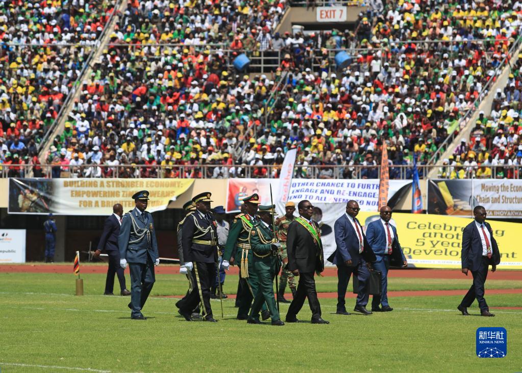 9月4日,在津巴布韋首都哈拉雷的國家體育場,津巴布韋當選總統姆南加古瓦(右四)在就職典禮上檢閱儀仗隊。