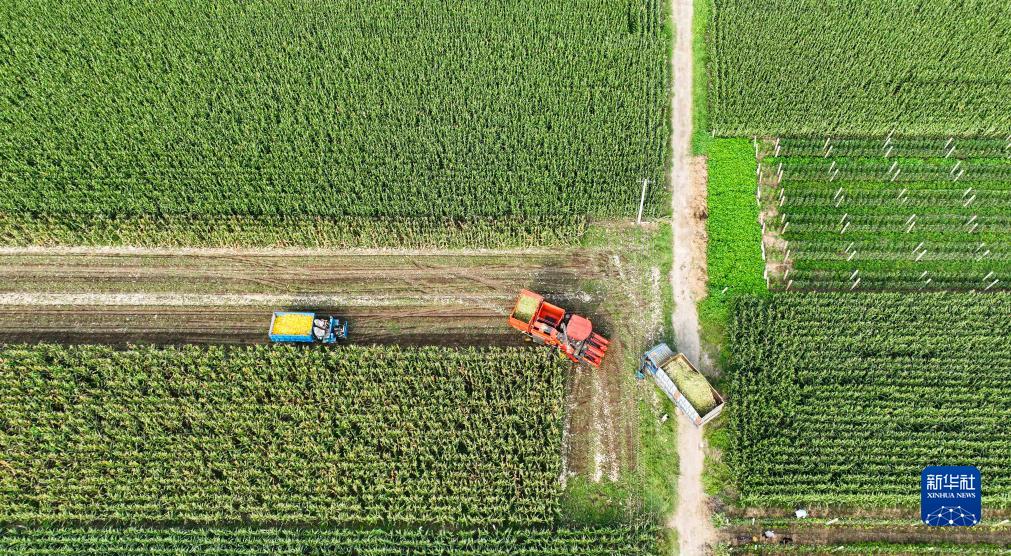 9月5日,河北省唐山市海港經濟開發區王灘鎮的農民駕駛農機收獲玉米(無人機照片)。