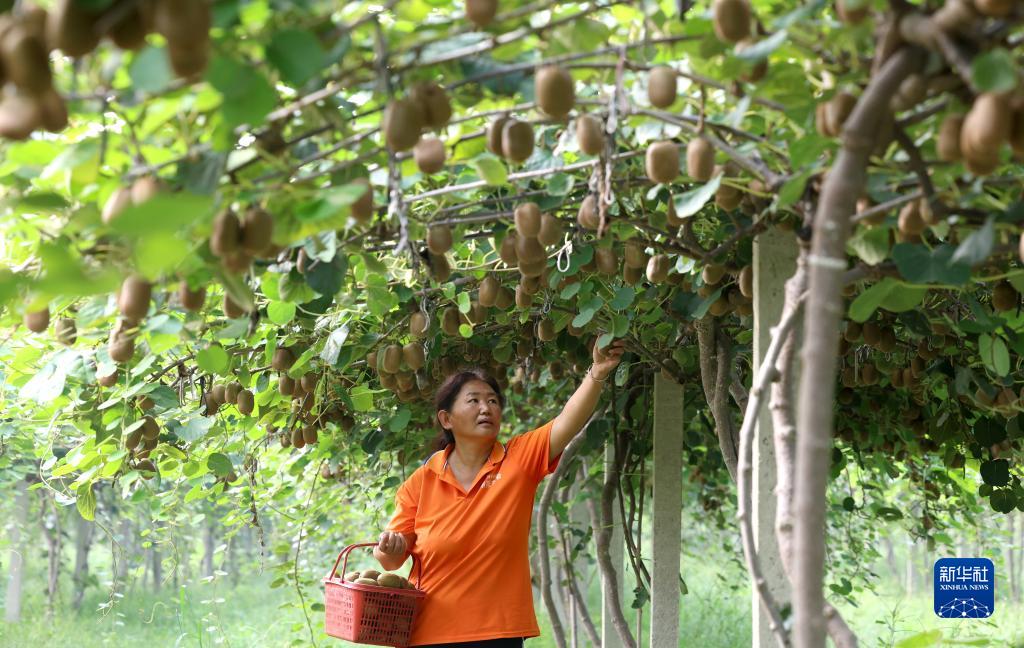 9月5日,農戶在河北省石家莊市行唐縣龍州鎮獼猴桃種植基地采收獼猴桃。