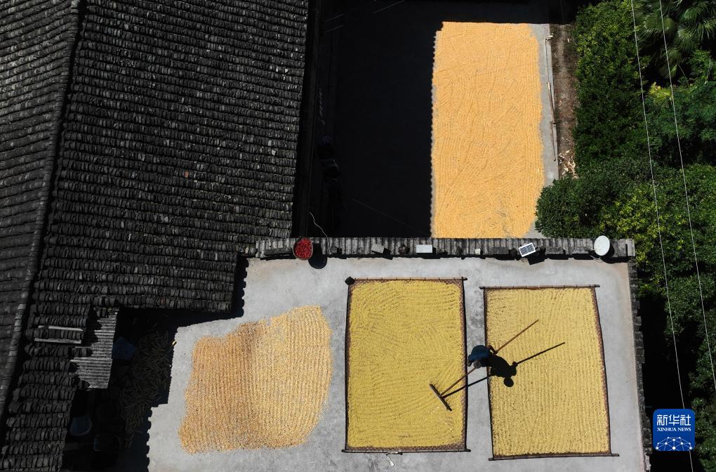 9月4日,重慶市黔江區黑溪鎮光明村村民在晾曬黃豆(無人機照片)。