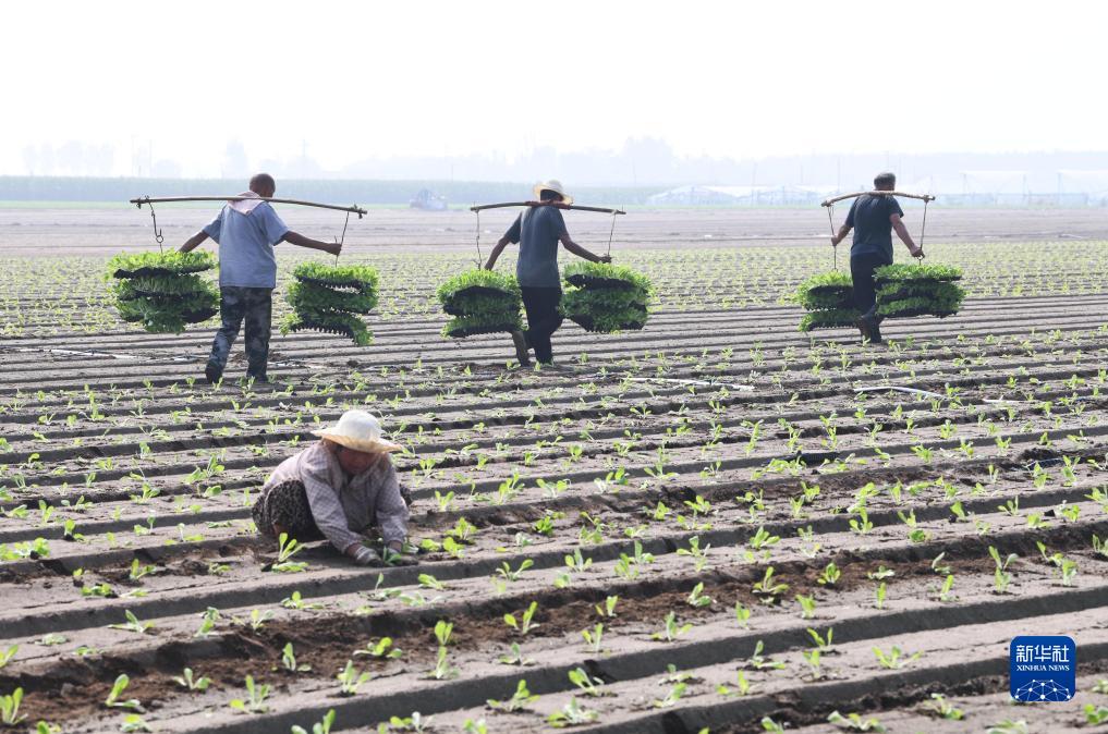 9月4日,河北省石家莊新樂市東牛林村農民在種植大白菜。