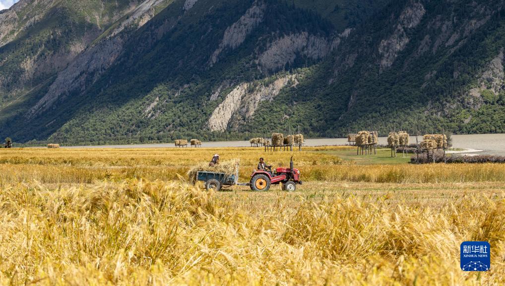 位于西藏昌都市八宿縣境內的然烏湖是西藏東部最大的湖泊,八宿縣然烏鎮瓦巴村坐落在然烏湖畔。正值秋收農忙時節,大片金黃的青稞在風中搖曳,然烏湖景與秋收盛況交相輝映,勾勒出一幅優美的田園畫卷。