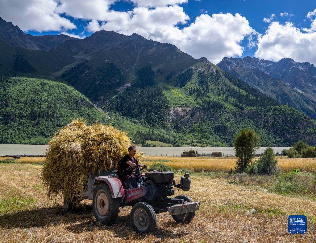 西藏昌都市八宿縣然烏鎮瓦巴村村民開著拖拉機運送剛收割完的青稞(9月4日攝)。