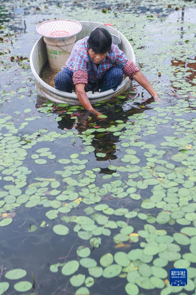 9月5日,在建德市航頭鎮烏龍村莼菜基地,村民劃著“盆船”在西湖莼菜產業園種植基地采摘西湖莼菜。