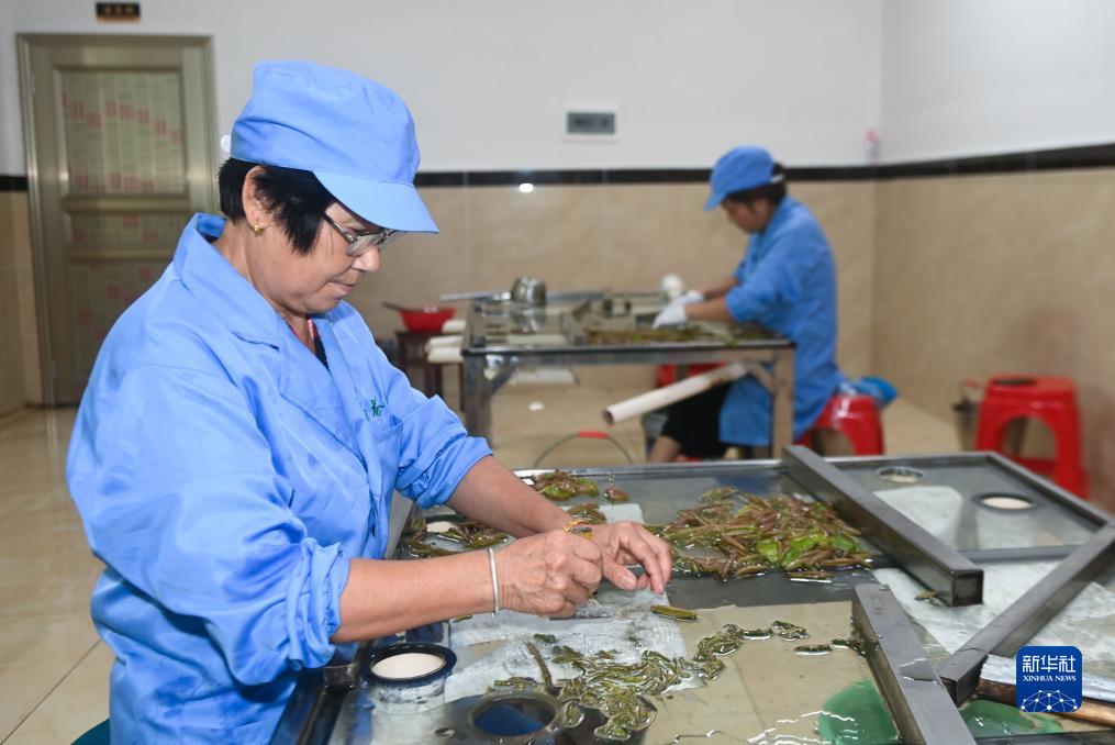 9月5日,在建德市航頭鎮烏龍村西湖莼菜產業園的車間內,工人在分揀剛剛采摘的莼菜。