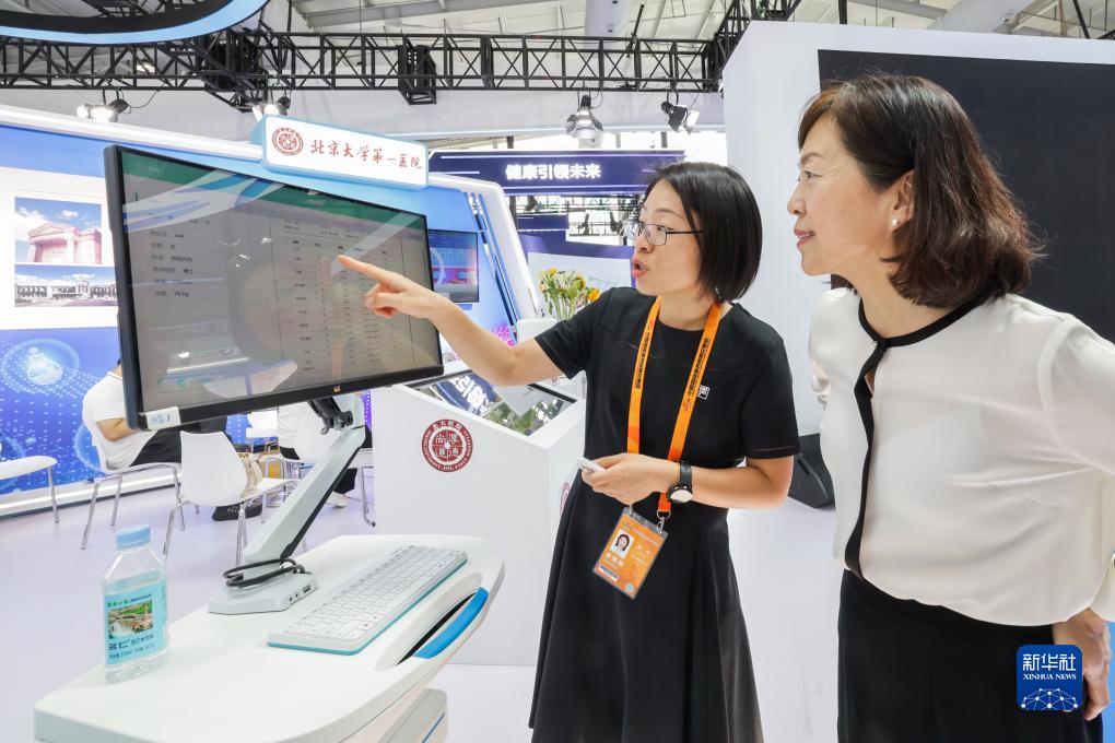 9月4日,在服貿會首鋼園區北京協和醫院展臺,工作人員向參觀者介紹神經功能平衡測試系統。