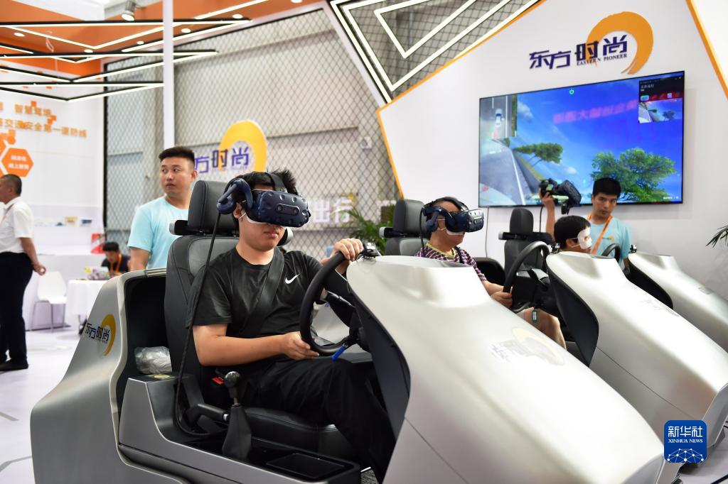 9月5日,觀眾在服貿會首鋼園區體驗東方時尚駕校的vr模擬駕駛機。