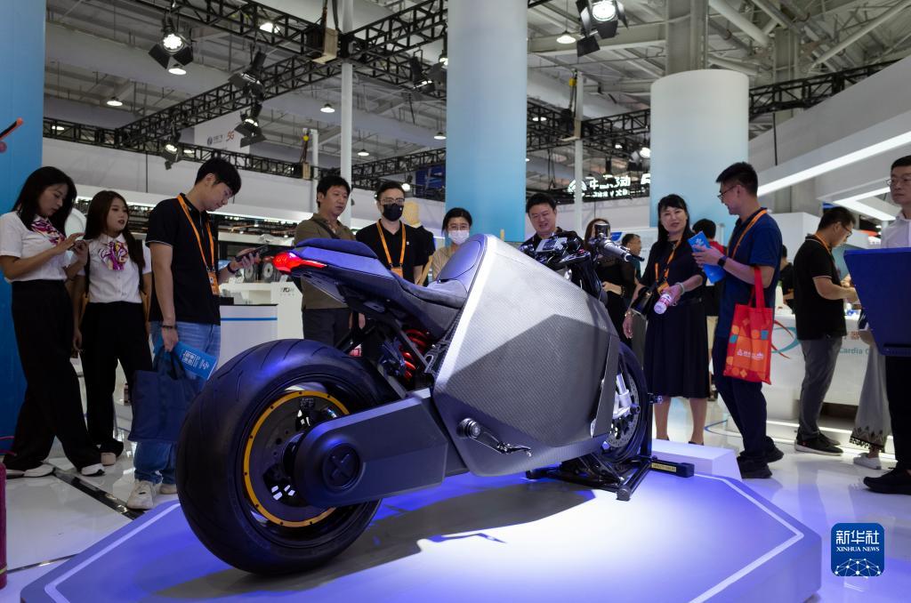 9月5日,觀眾在服貿會首鋼園區的中關村科技園房山園展臺參觀一款電動摩托車。