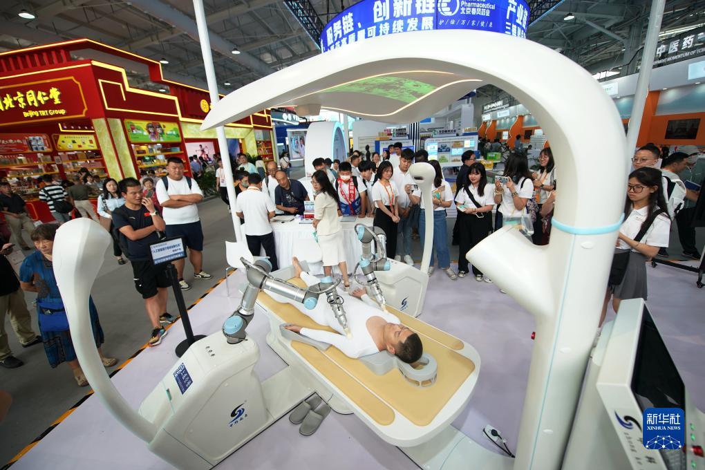 9月5日,參觀者在服貿會首鋼園區的健康衛生服務專題展內觀看數字中醫循經治療機器人展示。