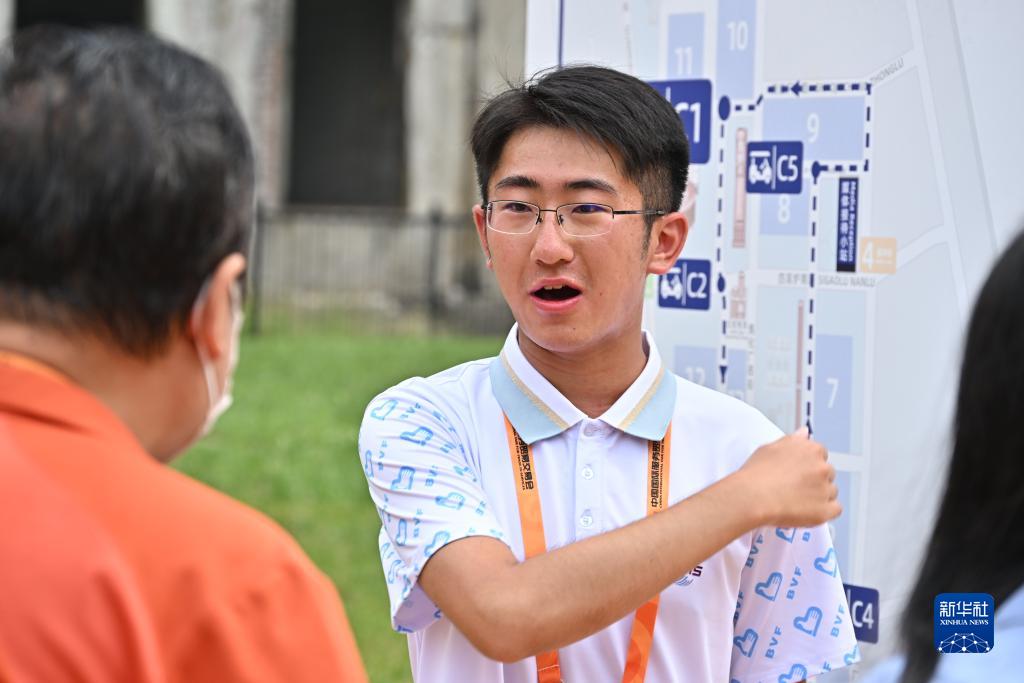 9月5日,中國農業大學的大學生志愿者李星哲在首鋼園為參觀者指路。