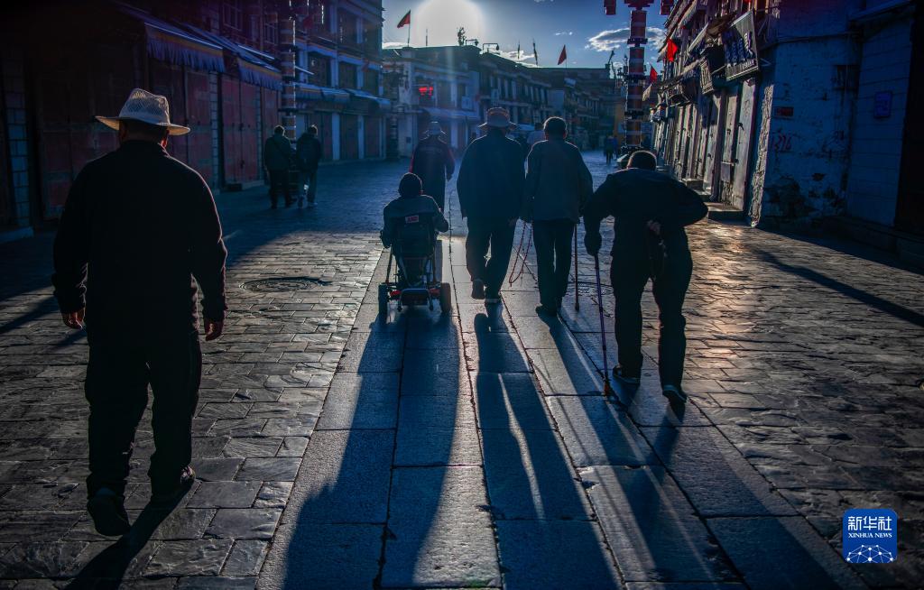 拉巴頓珠(騎電動輪椅車者)在清晨的八廓街(9月3日攝)。