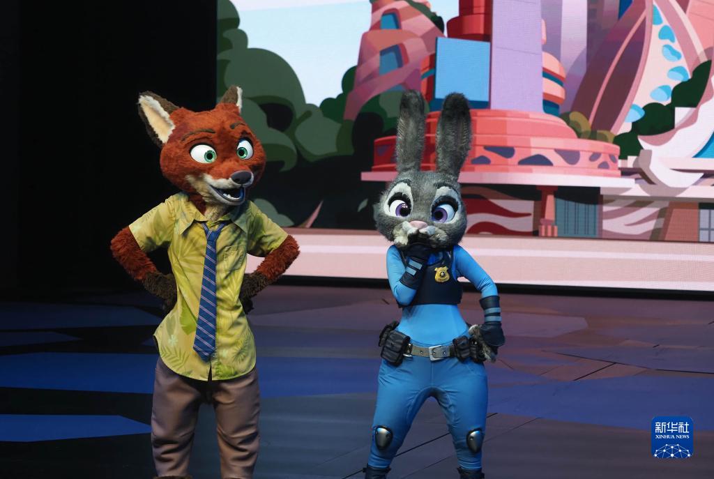 9月5日,在上海迪士尼樂園“瘋狂動物城”園區揭曉儀式上,“狐貍尼克”和“兔子警官朱迪”亮相。