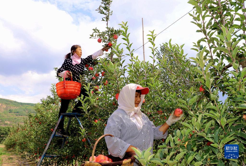 9月5日,在靜寧縣城川鎮紅旗村,果農采摘早熟蘋果。