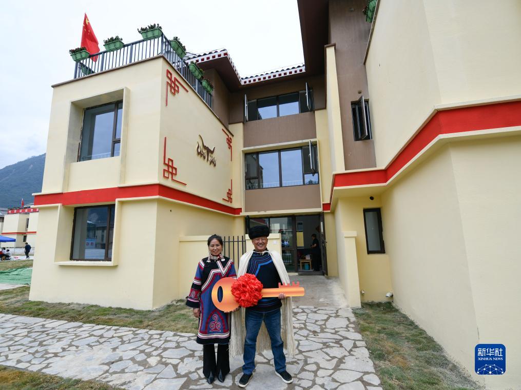 9月5日,在瀘定縣磨西鎮幸福新村,村民肖學英(左)和丈夫在新家前合影。