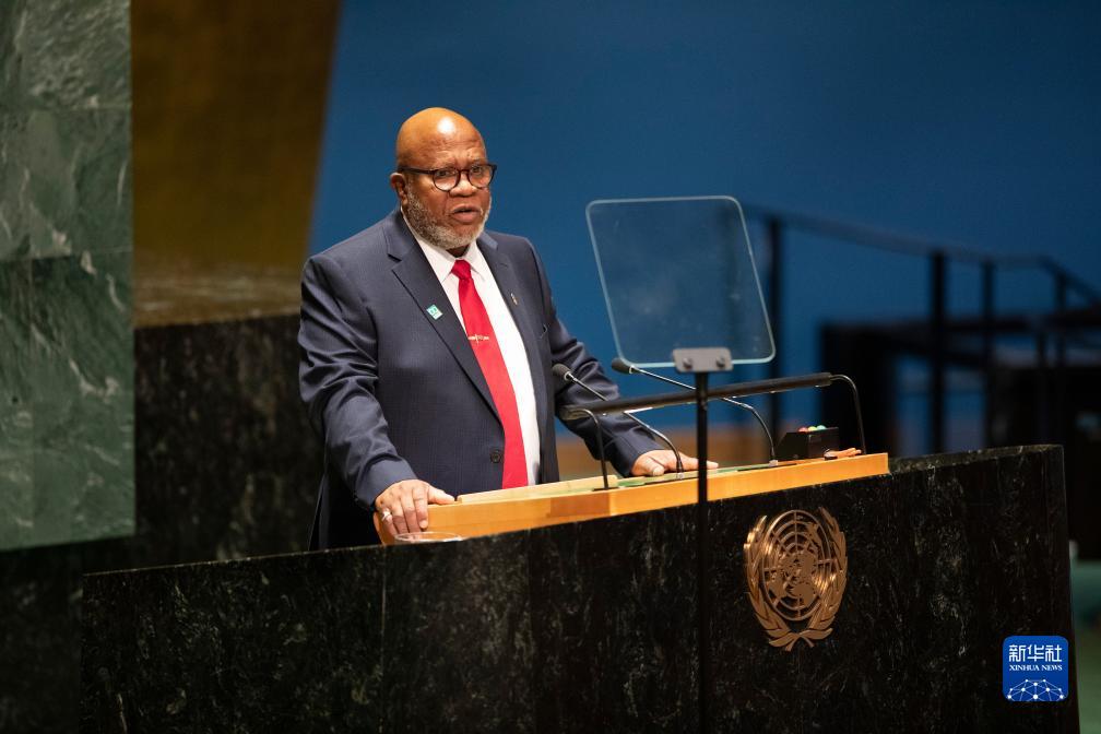 9月5日,在位于紐約的聯合國總部,第78屆聯合國大會主席丹尼斯·弗朗西斯在新一屆聯大第一次全會上致辭。