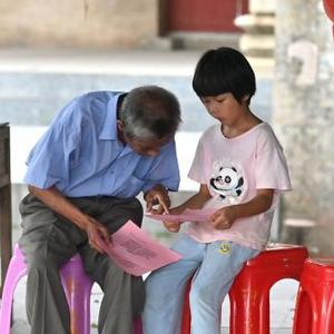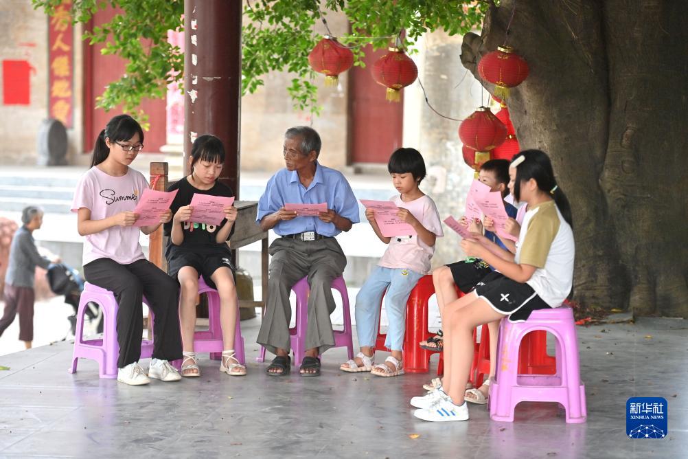在梧州市長洲區長洲鎮泗洲村,陳明仲(左三)在教小學生唱下俚歌(8月24日攝)。