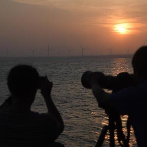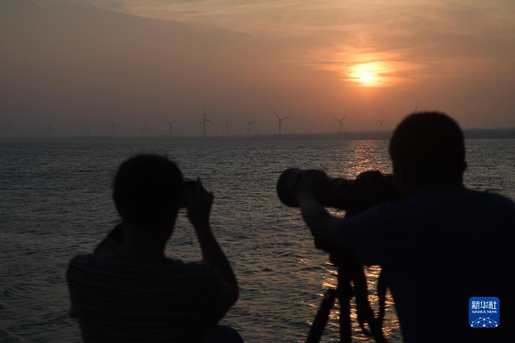 9月5日,游客在河北省張家口市懷來縣官廳水庫拍攝日落。