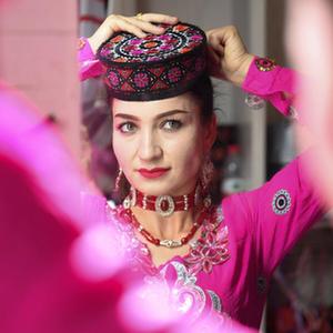 在新疆塔什庫爾干塔吉克自治縣帕米爾旅游區游客服務中心,縣文工團演員唱歌跳舞歡迎游客(9月4日攝)。